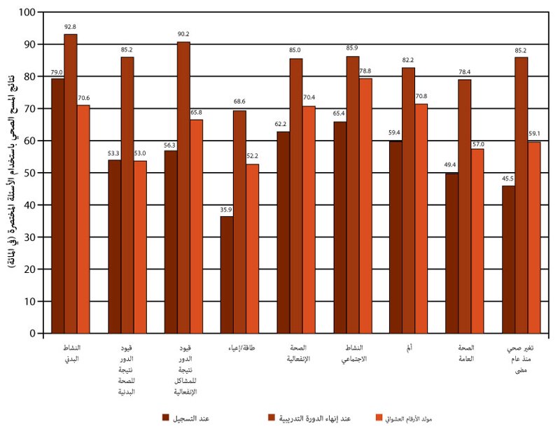 يوضّح الشكل 2 في شكل رسم بياني متوسط النتائج الخاصة بإستمارة الإستبيان التي تم حسابها باستخدام منهجية مؤسسة راند، ومقارنتها بمعايير السكان في الولايات المتحدة بالنسبة للضباط الذين أكملوا البرنامج.